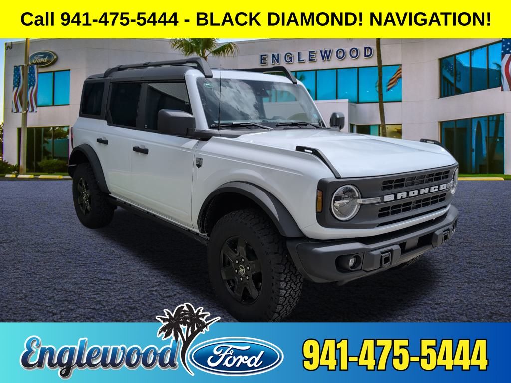 2025 Ford Bronco BLACK DIAMOND!, NAVIGATION!, 4-Wheel Disc Brakes, 4.46 Final Drive Ratio w/Rear Locking Differential, 7 Speakers, ABS brakes, Air Conditioning, AM/FM radio: SiriusXM with 360L, Auxiliary Switches, Black Diamond Package, Black Roof Rails w/Crossbars, Carbonized Gray Molded-In-Color Hard Top, Compass, Connected Navigation, Electronic Stability Control, Emergency communication system: 911 Assist, Equipment Group 222A Mid Package, Exterior Parking Camera Rear, Front Bucket Seats, Fully automatic headlights, Illuminated entry, Leather Shift Knob, LED Fog Lamps, Outside temperature display, Overhead console, Passenger vanity mirror, Powder Coated Steel Front & Rear Bumpers, Power steering, Power windows, Rear-Window Defroster & Washer, Remote keyless entry, Rock Rails, Security system, SiriusXM w/360L, Speed control, Steering wheel mounted audio controls, SYNC® 4, Telescoping steering wheel, Tilt steering wheel, Traction control, Trip computer, Washout Capable Rubberized Flooring, Wheels: 17″ Black High Gloss Painted Aluminum. Big Bend 4WD 10-Speed Automatic
