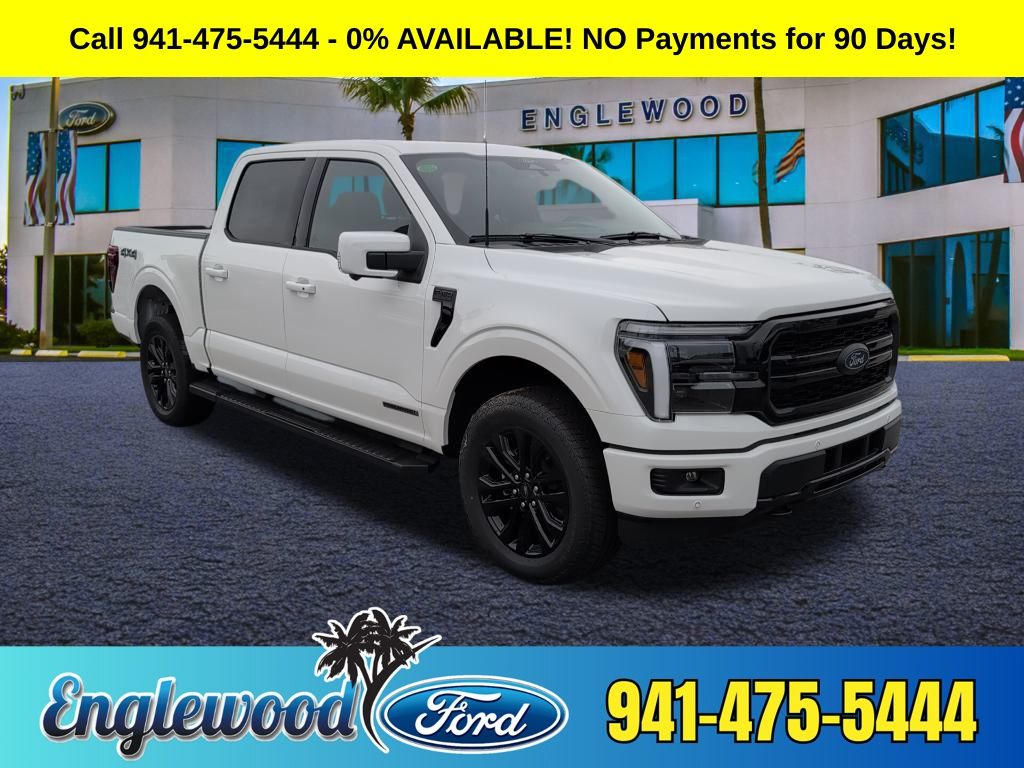 2025 Ford F-150 0% AVAILABLE!, NO Payments for 90 Days!, 2nd Row Heated Seats, 8 Speakers, ABS brakes, ActiveX Trimmed Bucket Seats (B), Air Conditioning, AM/FM radio: SiriusXM with 360L, Ambient Lighting – Ice Blue Color Only, Auto-dimming door mirrors, Auto-dimming Rear-View mirror, Automatic temperature control, Black Exterior Badging, Black Grille, Black Taillamp Bezels, Body-Color Front & Rear Bumpers, Body-Color Skull Caps & Door Handles, Compass, Console Worksurface, Dark Interior Appliques, Driver door bin, Electronic Locking w/3.73 Axle Ratio, Electronic Stability Control, Emergency communication system: SYNC® 4 911 Assist, Equipment Group 502A High, Front Bucket Seats, Front Center Armrest, Front dual zone A/C, Front fog lights, Fully automatic headlights, Garage door transmitter, Gray Box Side Decal, Heads-Up Display, Heated front seats, Heated steering wheel, Illuminated Driver & Passenger Visors, Illuminated entry, LARIAT Black Appearance Package, Matte Black Tailgate F-150 Decal, Memory seat, Mobile Office Package, Navigation system: Connected Navigation, Outside temperature display, Overhead console, Partitioned Lockable Rear Storage, Pedal memory, Power driver seat, Power passenger seat, Power steering, Power windows, Power-Sliding Rear Window, Pro Power Onboard – 7.2KW, Radio: B&O Unleashed Sound System by Bang & Olufsen, Rear step bumper, Remote keyless entry, Security system, Speed control, Steering wheel mounted audio controls, SYNC® 4 w/Enhanced Voice Recognition, Tachometer, Telescoping steering wheel, Tilt steering wheel, Traction control, Trip computer, Twin Panel Moonroof, Ventilated front seats, Wheels: 20″ Gloss Black Painted Aluminum, Wireless Charging. LARIAT 4WD 10-Speed Automatic